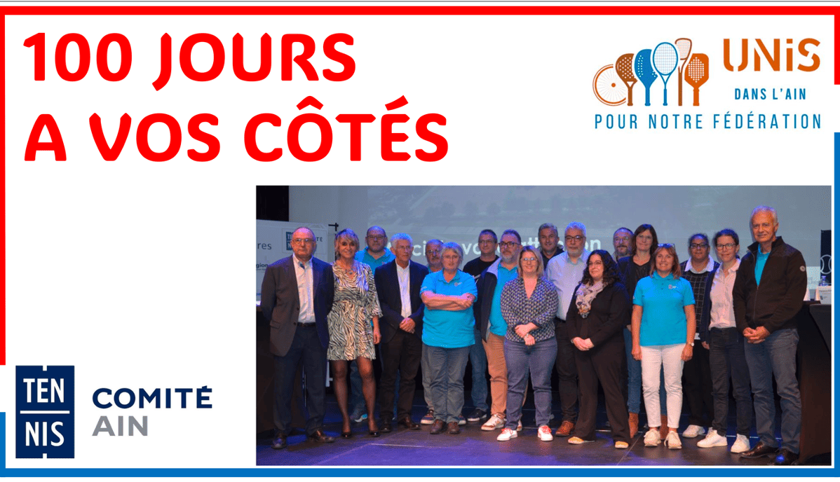 Dans les jours qui ont suivi l’élection, nous sommes entrés dans le mandat séance tenante : les président(e)s de commission et les chargés de mission ont été nommés sans délai afin de préparer leur équipe respective et envisager les actions à mettre en place dans un premier temps. Aussi, il nous importe de vous dresser à 100 jours d’exercice, une revue des actions de notre profession de foi mises en œuvre, à l’appui de la convention d’objectifs signée avec la Ligue ARA, car vous le savez, le Comité de l’Ain a accepté d’être pilote pour sanctuariser le déploiement de la politique fédérale sur notre territoire : le champ d’actions est varié, tous les acteurs de la sphère tennis sont concernés, certaines actions alignées sont récurrentes et parallèlement, des actions phares de notre feuille de route se sont déjà concrétisées pour nos jeunes, nos seniors, le tennis loisir et la compétition. En un mot, NOUS AVONS AGI.