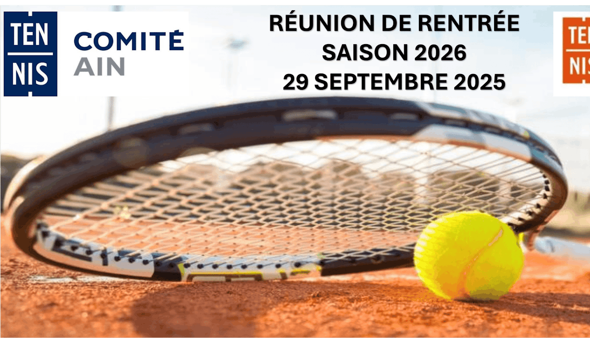 Le tennis aussi fait sa rentrée et dans ce cadre, avec l'ensemble du Comité de Direction, nous avons le grand plaisir de vous inviter à notre traditionnelle réunion de rentrée qui se tiendra le : Lundi 29 septembre 2025 à 19h00, à l'Espace du Lac - 665 Chemin de Curtafray, 01000 Bourg-en-Bresse.