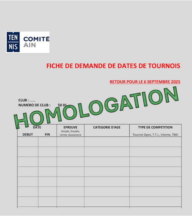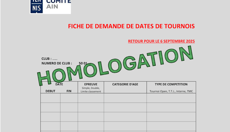 Afin de garantir une bonne harmonisation des tournois, TOUTES les dates des épreuves souhaitées entre le 1er mars et le 31 août 2026 (uniquement pour cette année) de l’ensemble des clubs doivent nous parvenir au plus tard le 6 septembre 2025.